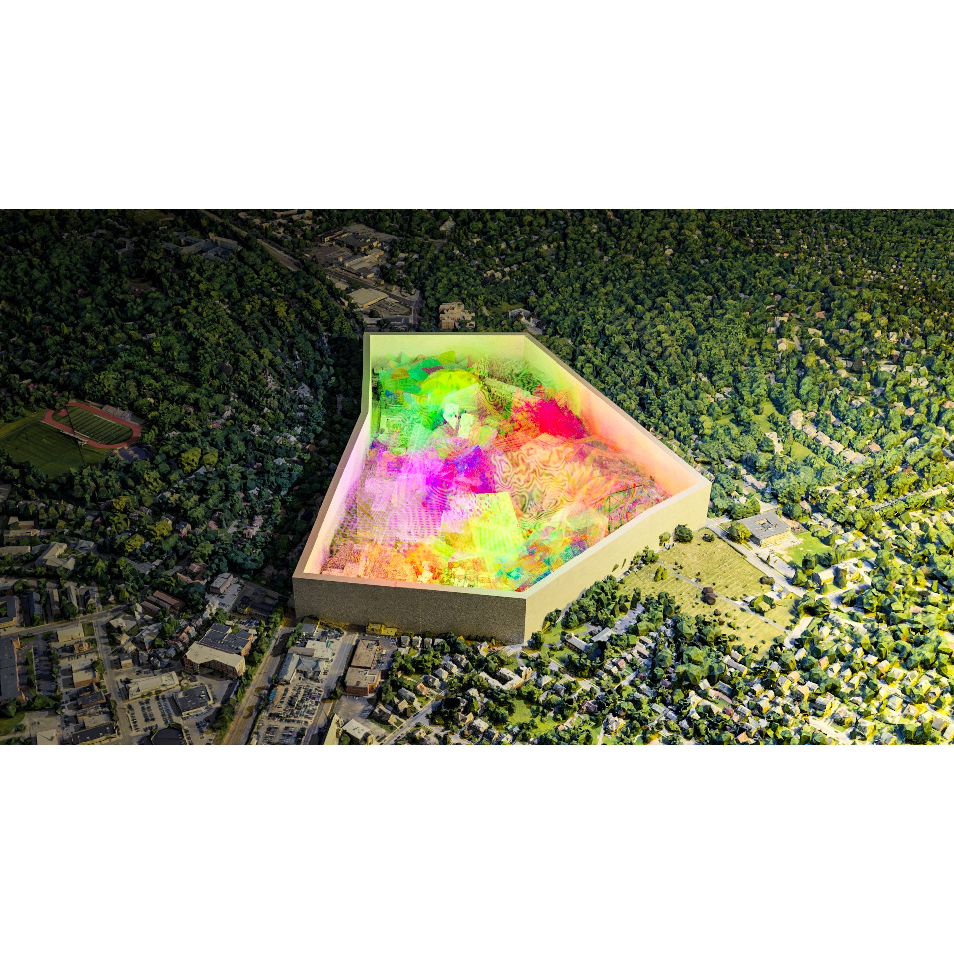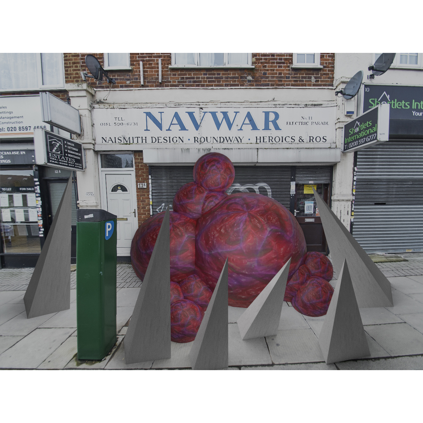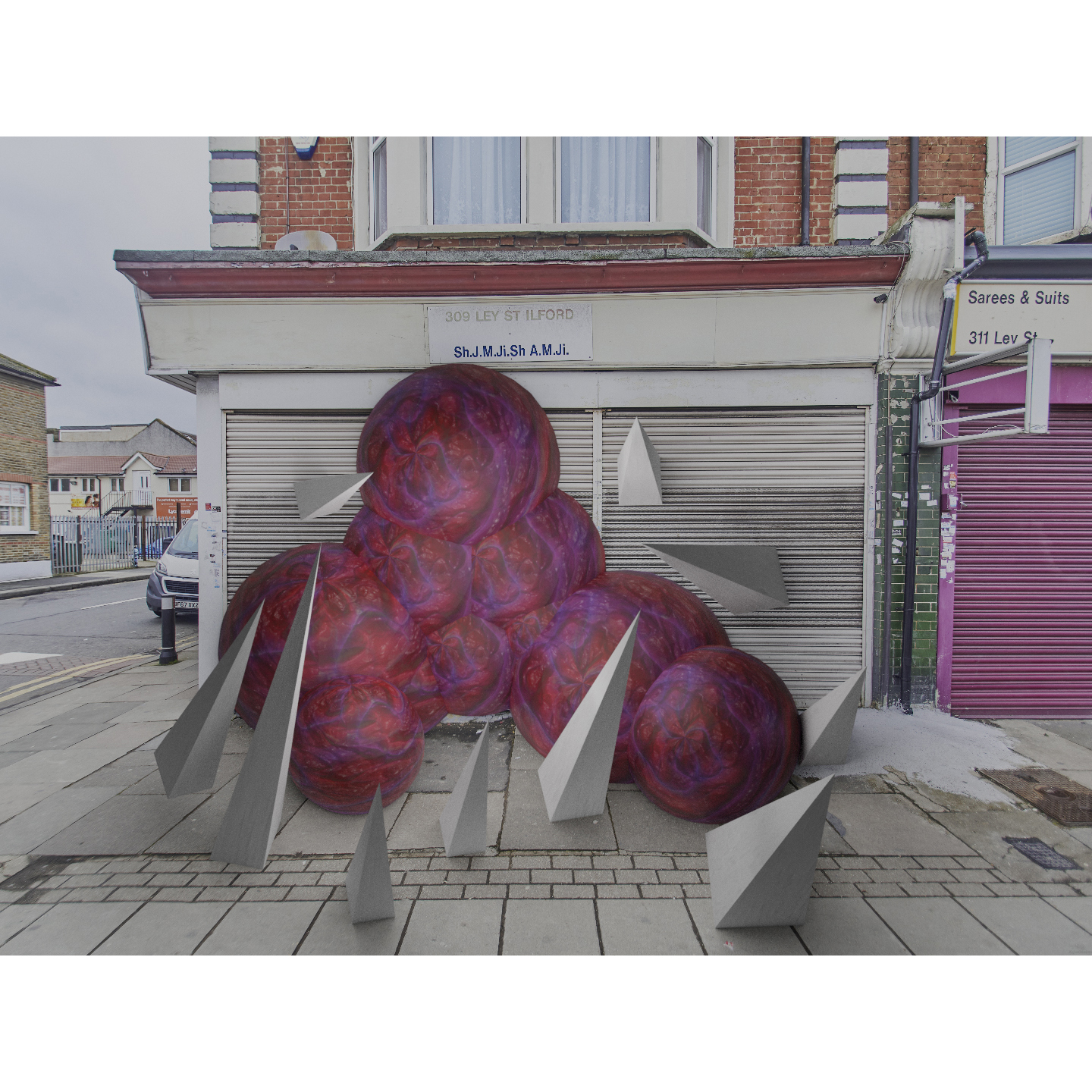 This artwork was made as a response to the economic impact of Covid on small businesses, local communities, and people’s income. The overall vision of the artwork was to showcase abandoned business that could not survive the economic crisis caused by the pandemic and to illustrate the impact with images that depicts the virus as this massive monster that has ravaged through the community. The sharp pyramids serve as a cage for the organic blob and as markers to the viewer that the blob is dangerous and should not be approached, similar technique was developed by the US government to mark nuclear waste sites, so that future humans would not approach them. Artwork was inspired by Christo and Jeanne Claude, Jóhann Jóhannsson, Katsuhiro Otomo, Daniel Thiger.