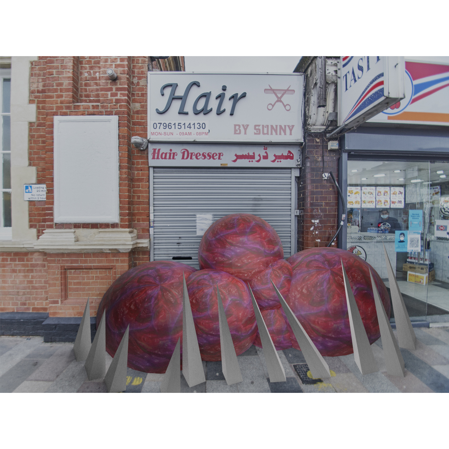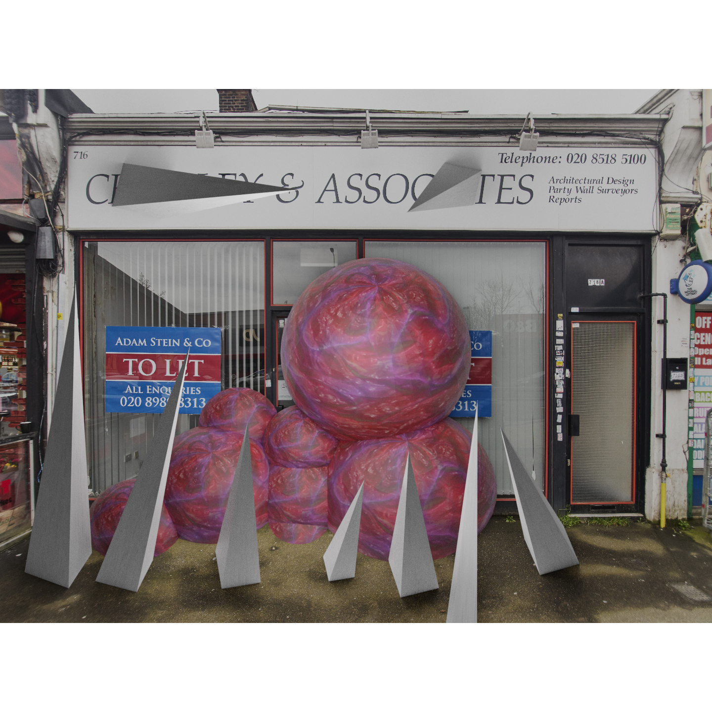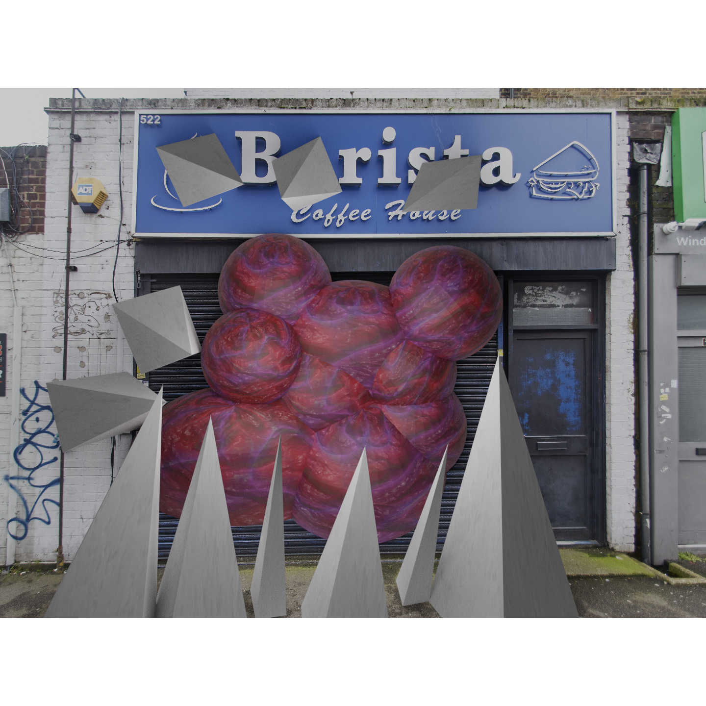 “At what cost?” is a photographic CGI project and commentary about the government’s half-hearted approach when it came to helping small businesses during lockdowns. The artist photographs closed businesses in his area and uses CGI software to create these abstract Lovecraftian landscapes where the businesses have been taken over by a monstrous organic blob and the only thing the blob from spreading are the abstract minimal pyramids.