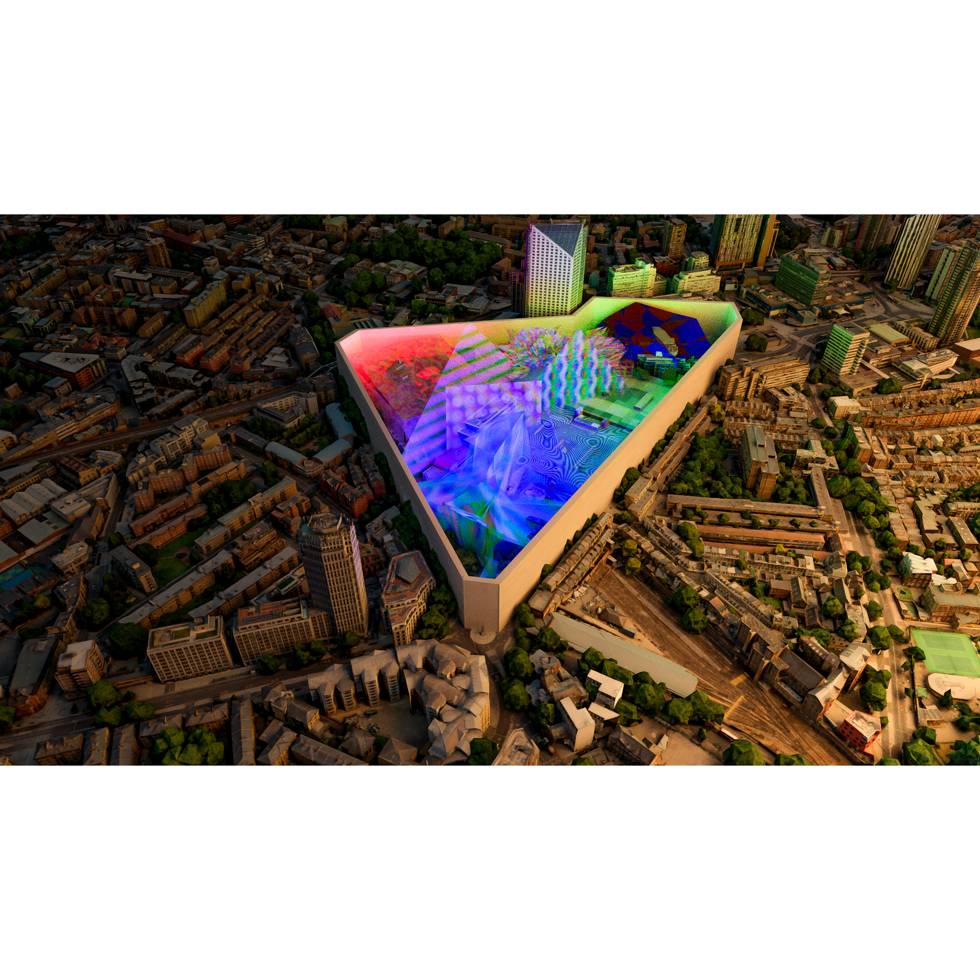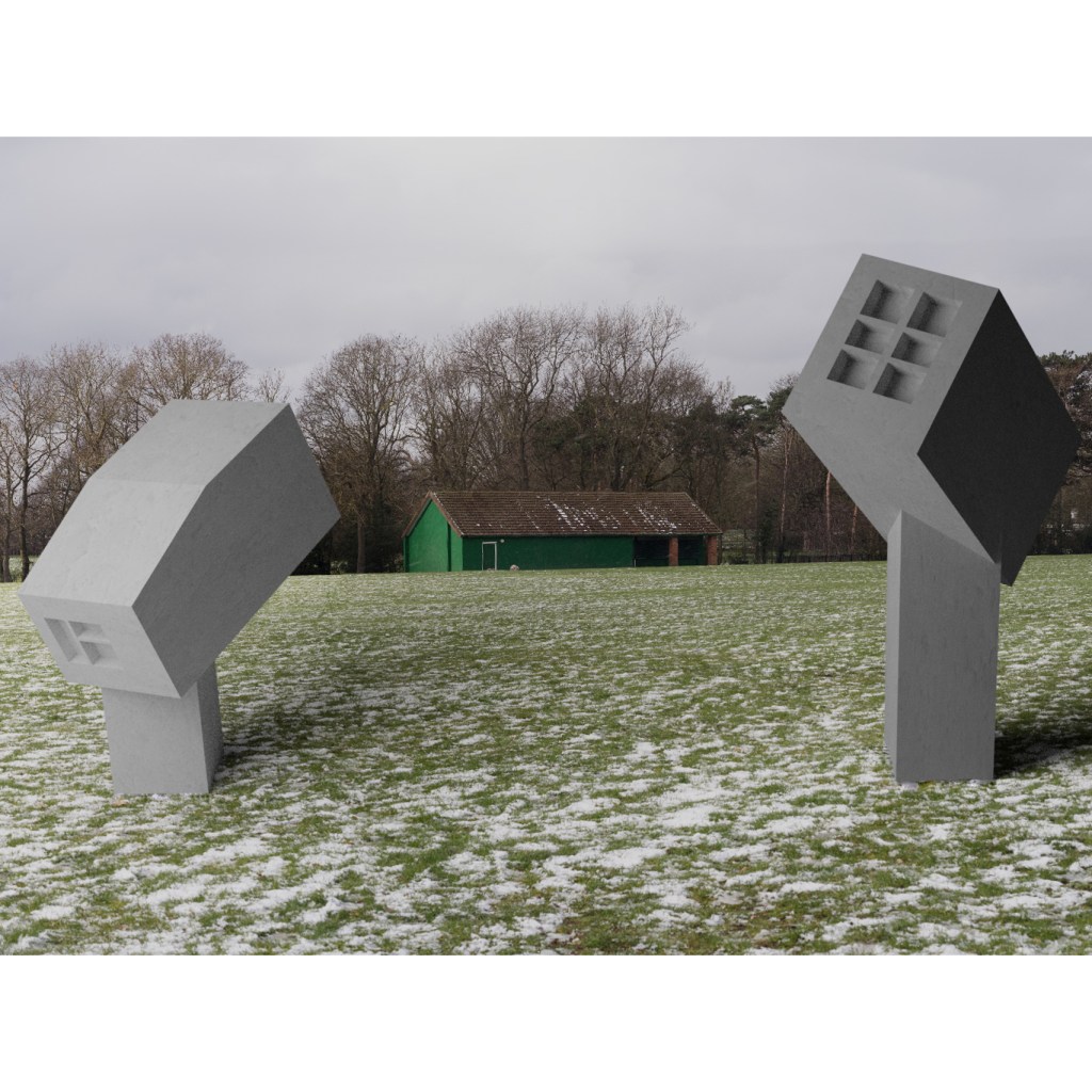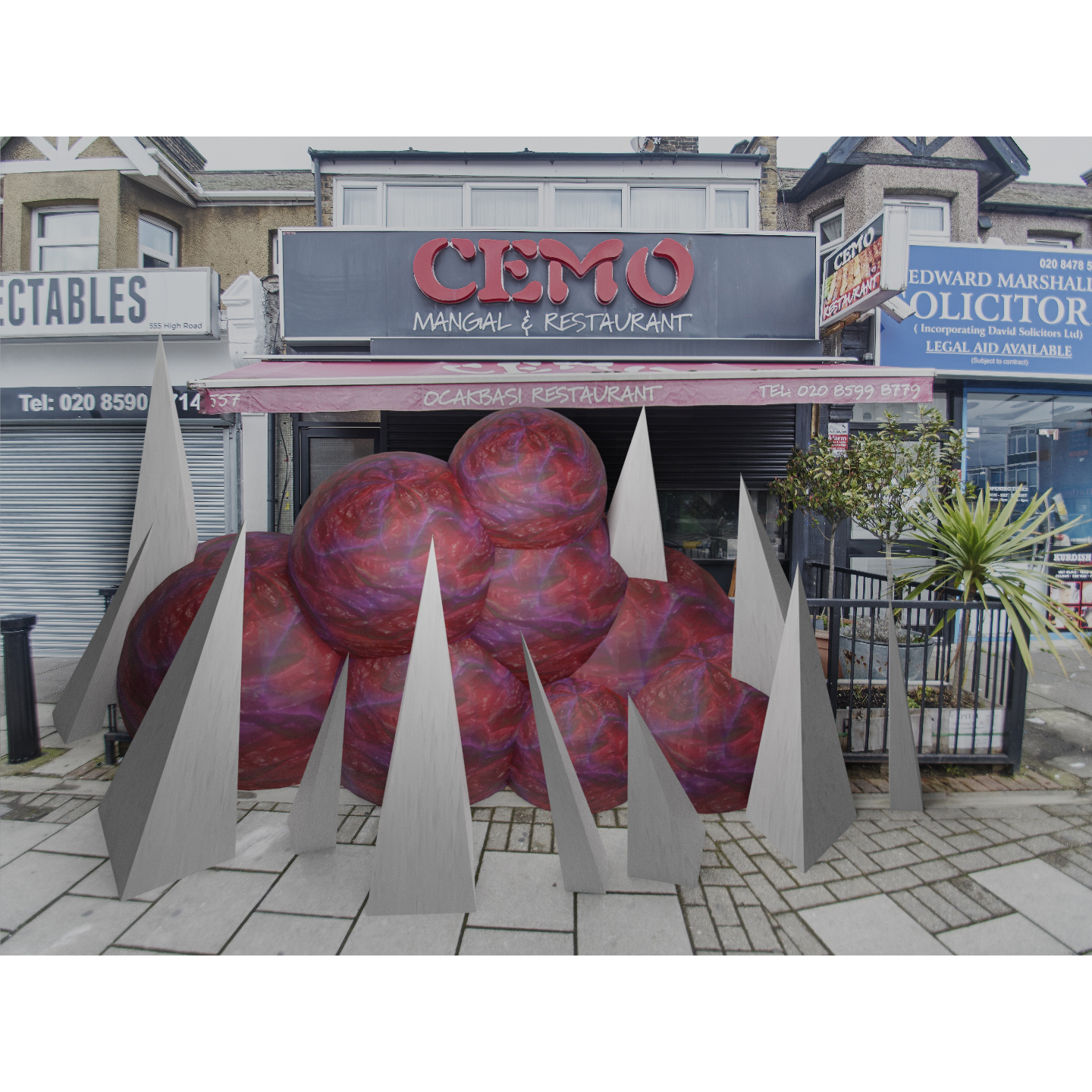 “At what cost?” is a photographic CGI project and commentary about the government’s half-hearted approach when it came to helping small businesses during lockdowns. The artist photographs closed businesses in his area and uses CGI software to create these abstract Lovecraftian landscapes where the businesses have been taken over by a monstrous organic blob and the only thing the blob from spreading are the abstract minimal pyramids.