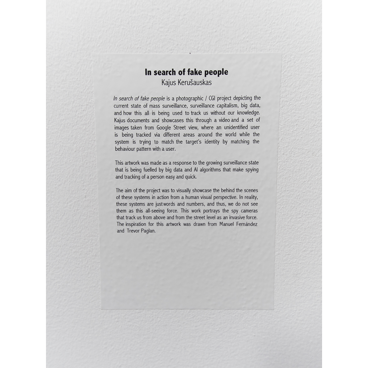 In search of fake people is a photographic / CGI project depicting the current state of mass surveillance, surveillance capitalism, big data, and how this all is being used to track us without our knowledge. Kajus documents and showcases this through a video and a set of images taken from Google Street view, where an unidentified user is being tracked via different areas around the world while the system is trying to match the target’s identity by matching the behaviour pattern with a user.